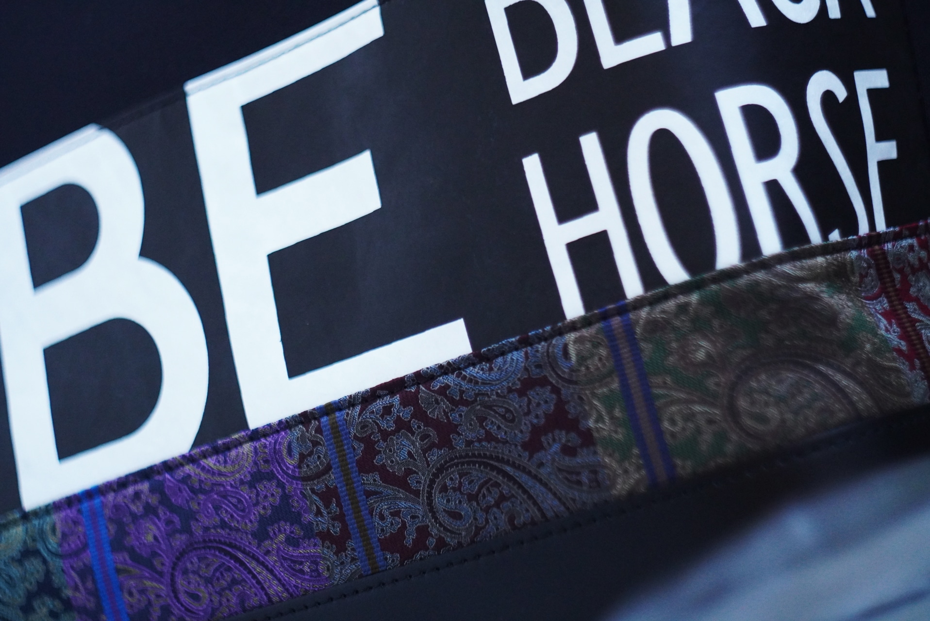上段には従来スタイルと同様の実物バスロールサイン生地、下段には80年代に製造された西陣織ヴィンテージネクタイ生地の試験織見本を使用。ネクタイを商品化する手前で配色を確認するために出される一点物の見本生地です