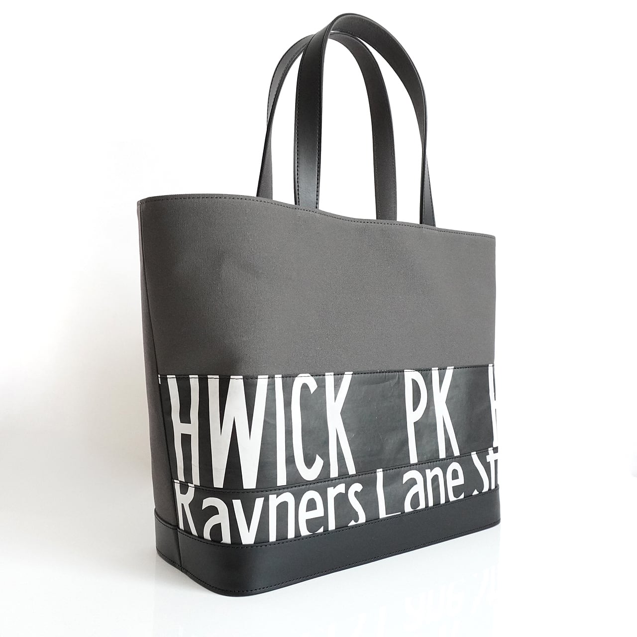 80年〜90年代に役目を終えた英国ロンドンバスの車体に実際に搭載されたタイベック製のロールサイン(バスの前面で回転して変わる行き先案内表示)と高品質な国産帆布を素材にし鞄職人よる縫製技術によって1つずつ手作業で丁寧に縫い上げる一点物のバッグです。