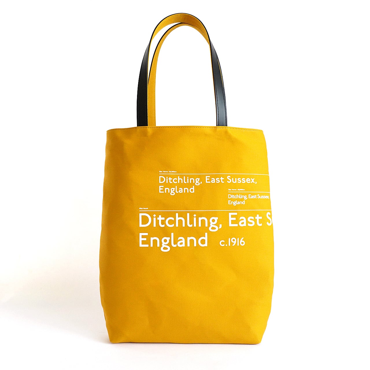 ロンドン地下鉄の書体を手がけた エドワード・ジョンストンの〈Johnston Sans〉、そして後を継いだ エリック・ギルの〈Gill Sans〉。20世紀の英国を代表する2つの書体を用い、デザインはカーニング(文字間の調整)をモチーフにしたタイポグラフィであしらっています。それぞれの書体制作者が活躍した地名や製作年を組み合わせた、普段使いの軽やかなトートバッグです。