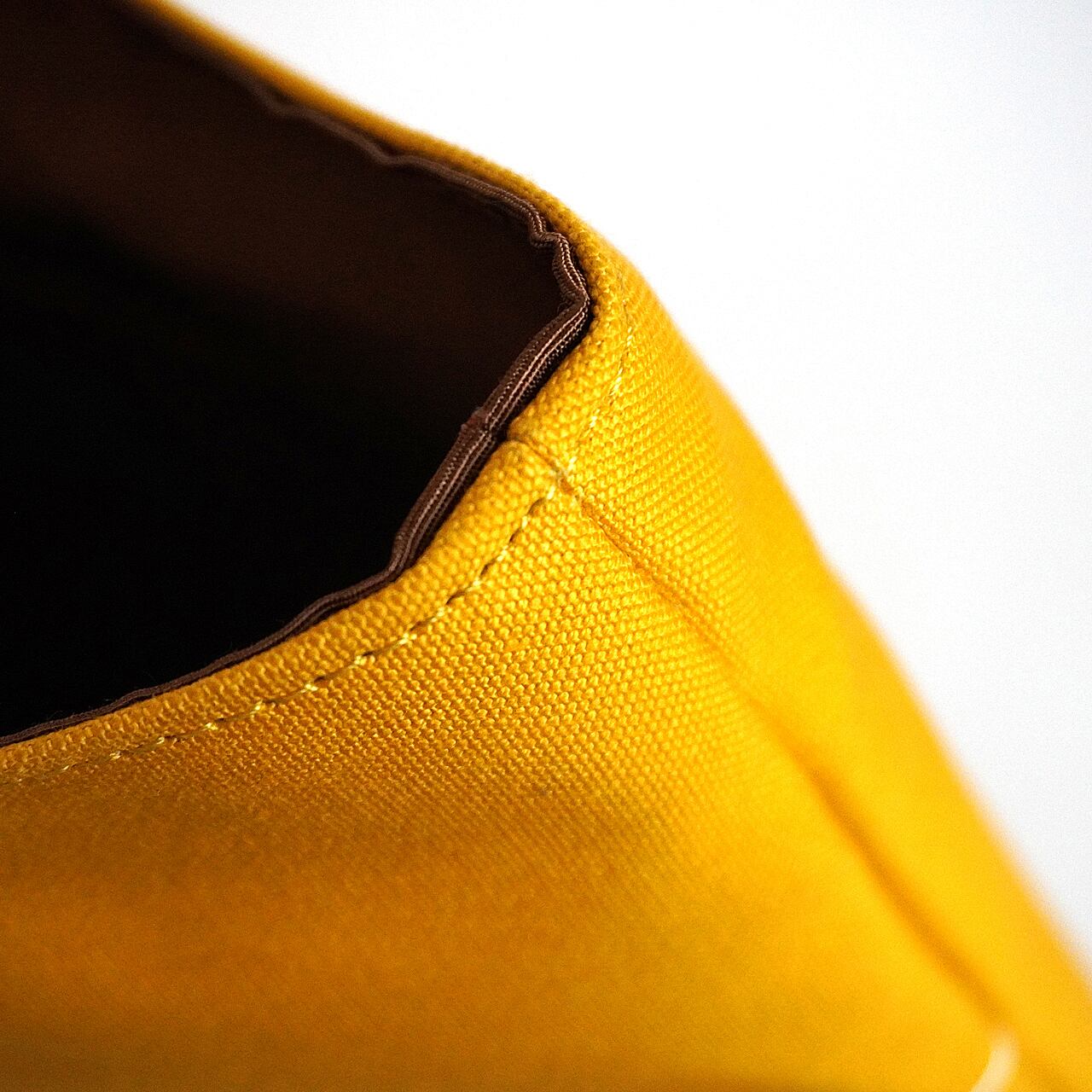 繊細なプロダクトですので、洗濯は型くずれの原因にもなることから、原則お勧めいたしておりませんが、帆布生地が汚れた場合は、薄めた中性洗剤をつけたやわらかい布で叩いて落としてください。帆布は多少色落ちする事がありますのでご注意ください。