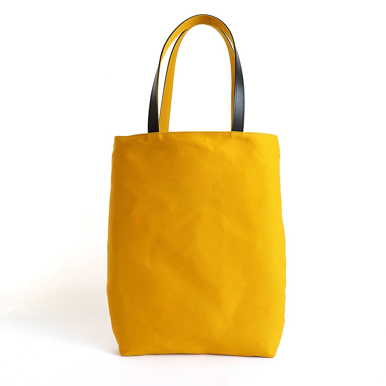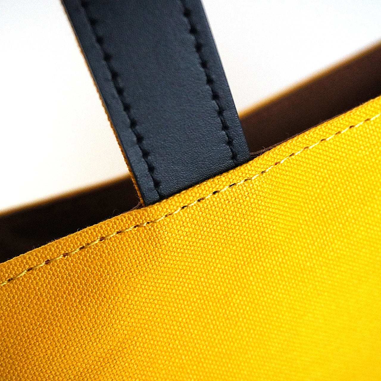 素材には国産11号キャンバス・綿オックス・レーヨン裏地による三層構造を採用し、軽さと堅牢さを兼ね備えています。持ち手は姫路のスムースレザーを使用し、共生地のキャンバスを重ねて縫い合わせています。