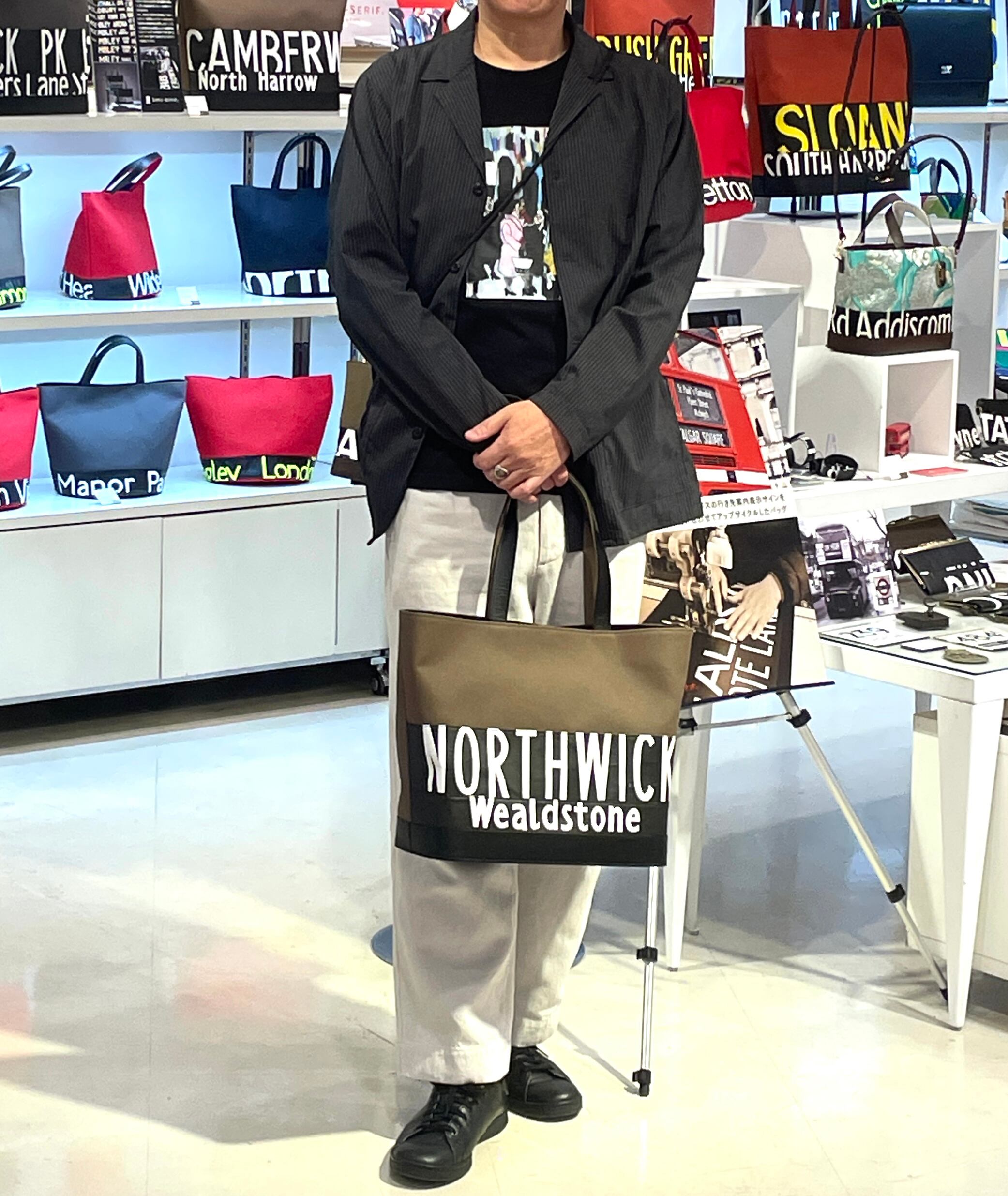 ロンドンの街角、バス停で静かにバスを待つ貴婦人が手にしているのは、SANS-SERIFのバッグ。アーティストの茶薗大暉氏の作品です。
