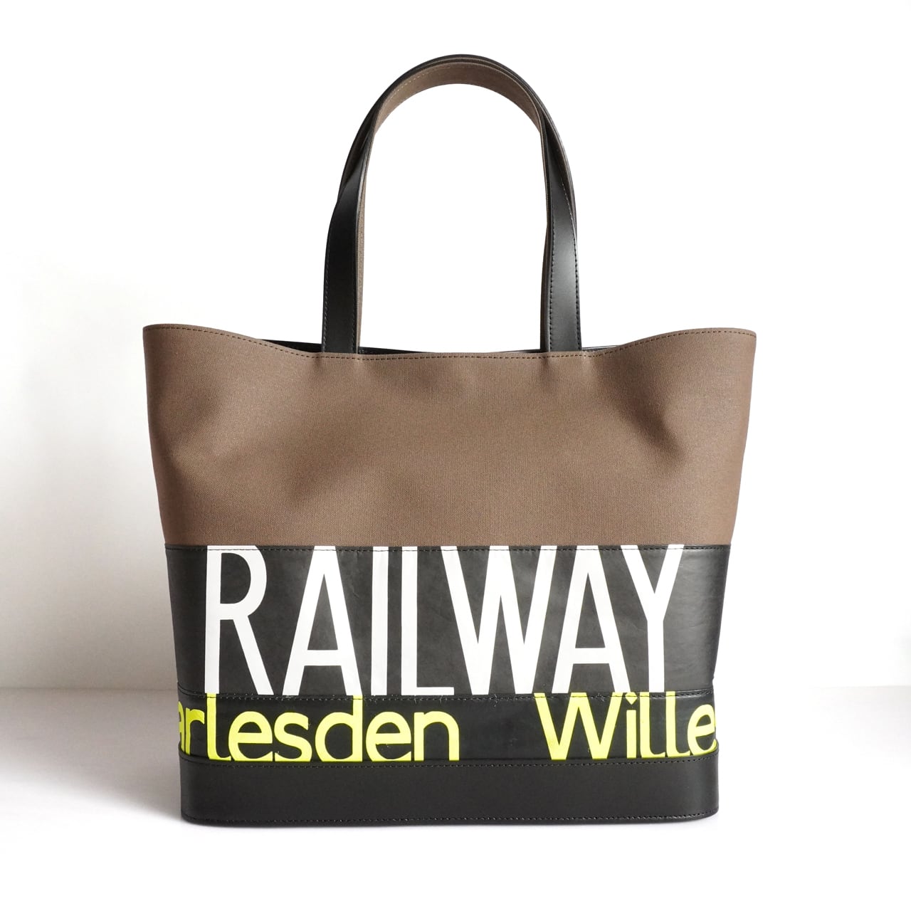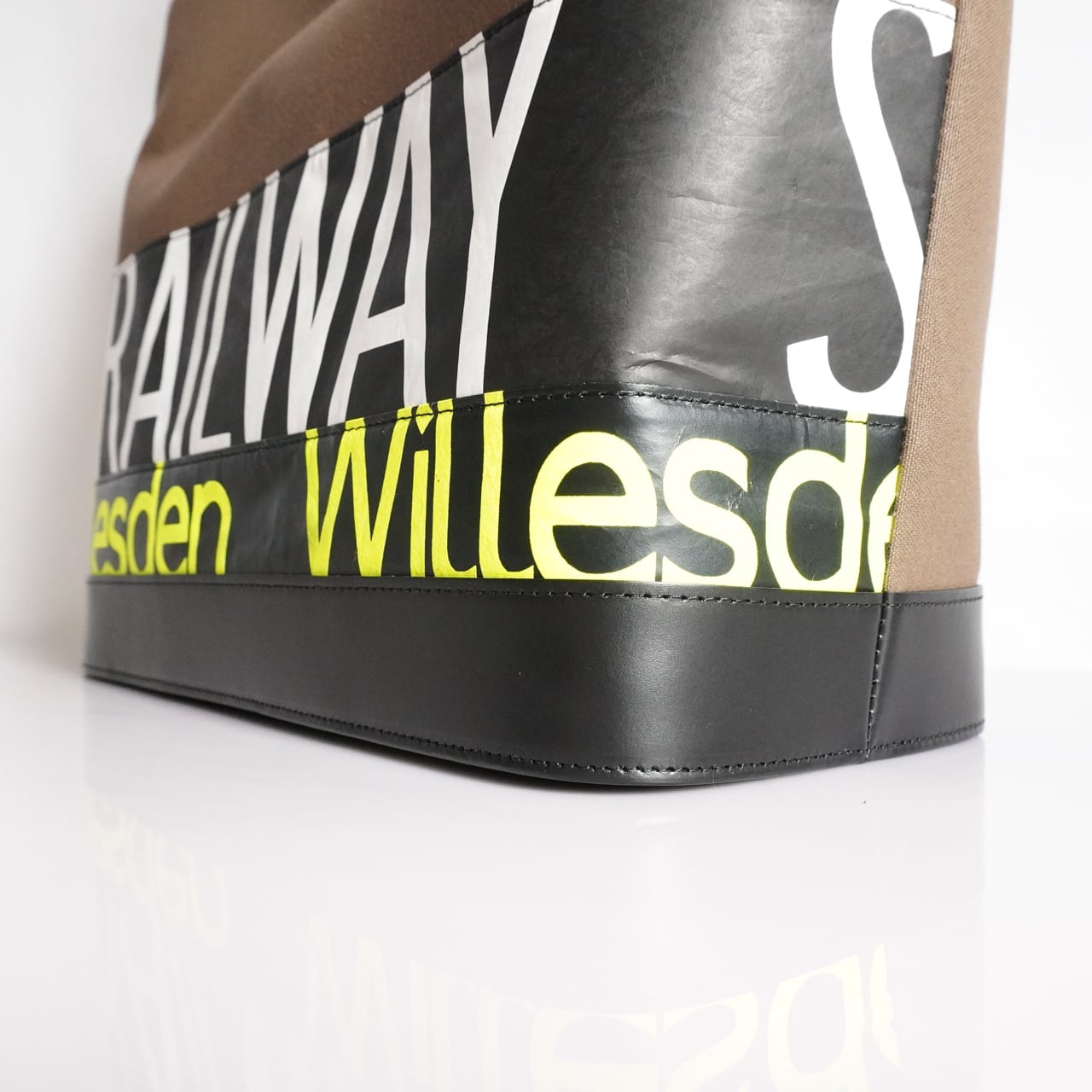 80年〜90年代に役目を終えた英国ロンドンバスの車体に実際に搭載されたタイベック製のロールサイン(バスの前面で回転して変わる行き先案内表示)と高品質な国産帆布を素材にし鞄職人よる縫製技術によって1つずつ手作業で丁寧に縫い上げる一点物のバッグです。