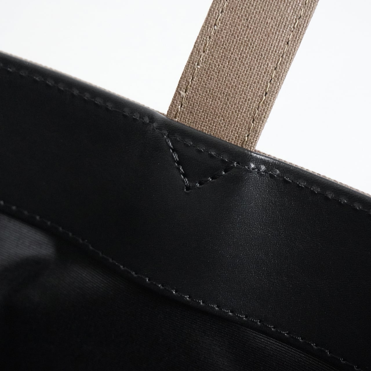 肩掛け・手持ちの両方で使い勝手の良いトートバッグ。普段使いに丁度良いサイズ感で、A4サイズの書類やノートパソコンもすっきり収納できます。しっかりとした国産帆布に加え、内側上部はレザー張り、底部も革の上げ底仕様となっており、床に置いてもストンと自立する美しいフォルムを保ちます。重厚感のある佇まいながら、見た目に反して軽量なつくりで、ビジネスからカジュアルまで幅広いシーンでご活用いただけます。