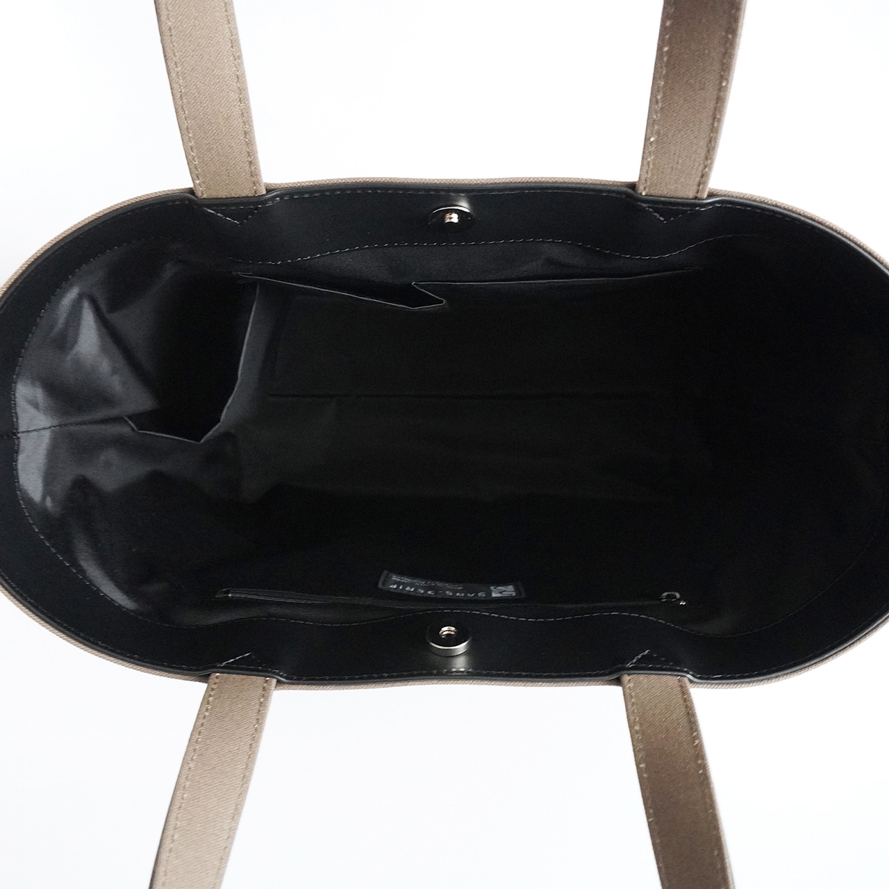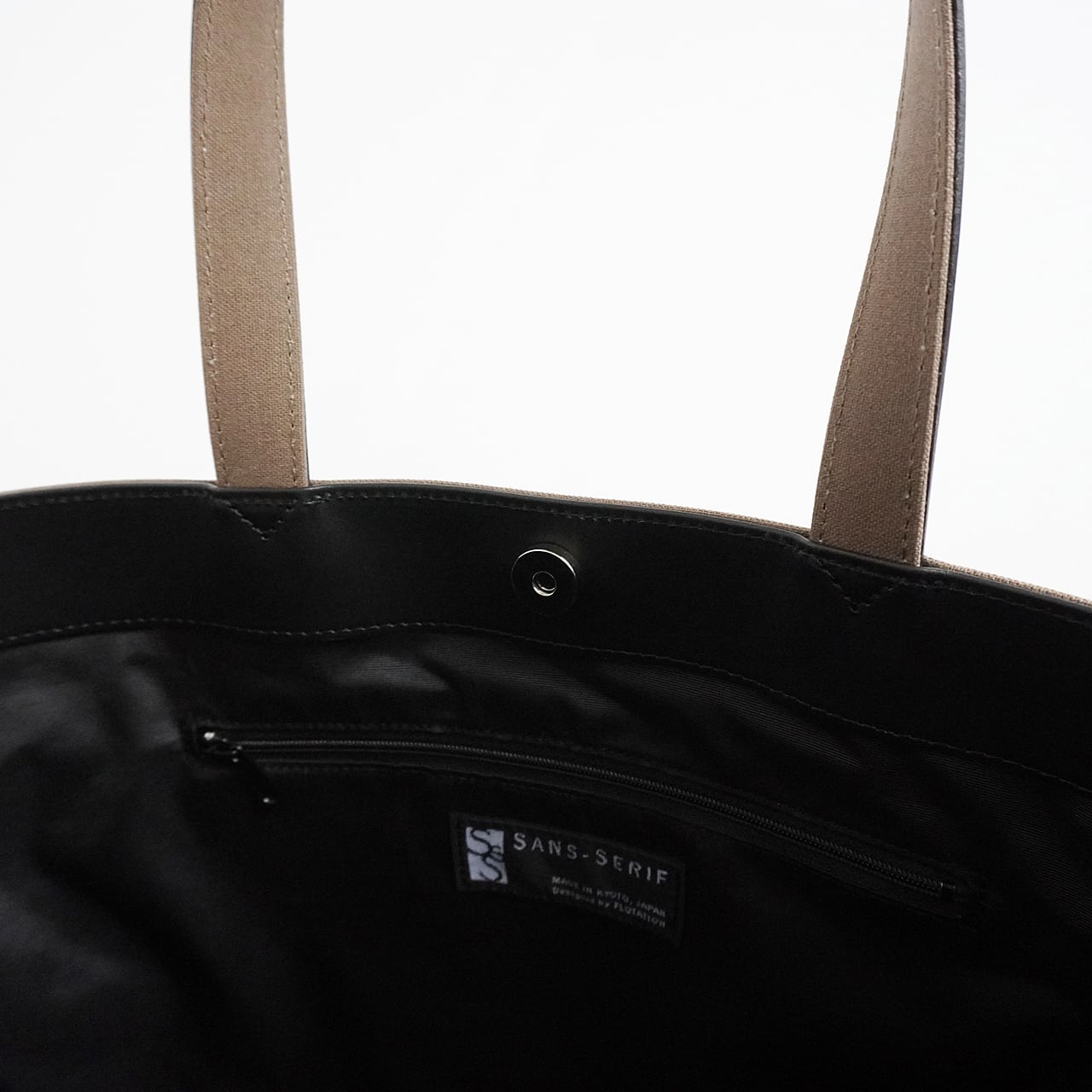 肩掛け・手持ちの両方で使い勝手の良いトートバッグ。普段使いに丁度良いサイズ感で、A4サイズの書類やノートパソコンもすっきり収納できます。しっかりとした国産帆布に加え、内側上部はレザー張り、底部も革の上げ底仕様となっており、床に置いてもストンと自立する美しいフォルムを保ちます。重厚感のある佇まいながら、見た目に反して軽量なつくりで、ビジネスからカジュアルまで幅広いシーンでご活用いただけます。