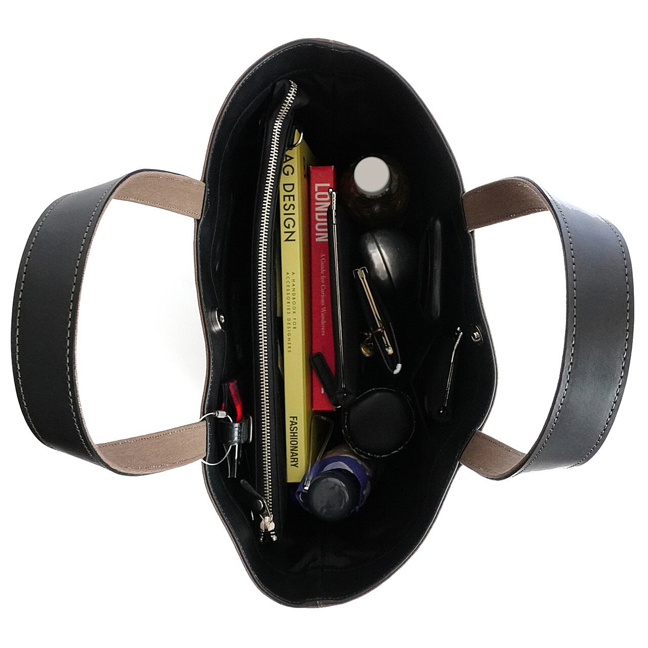 肩掛け・手持ちの両方で使い勝手の良いトートバッグ。普段使いに丁度良いサイズ感で、A4サイズの書類やノートパソコンもすっきり収納できます。しっかりとした国産帆布に加え、内側上部はレザー張り、底部も革の上げ底仕様となっており、床に置いてもストンと自立する美しいフォルムを保ちます。重厚感のある佇まいながら、見た目に反して軽量なつくりで、ビジネスからカジュアルまで幅広いシーンでご活用いただけます。