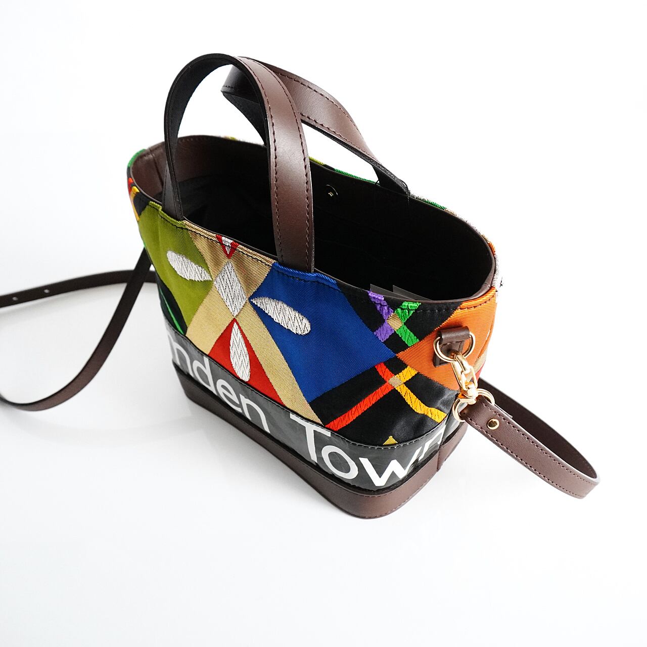 主に80年〜90年代に役目を終えた英国ロンドンバスの車体に実際に搭載されたロールサイン(バスの前面で回転して変わる行き先案内表示)と、呉服会社のコレクションとして大切に保管されていた約50年前の正絹袋帯 有職文様、その中でも金銀糸が施された文様部分を再利用して昇華させたショルダーバッグです。