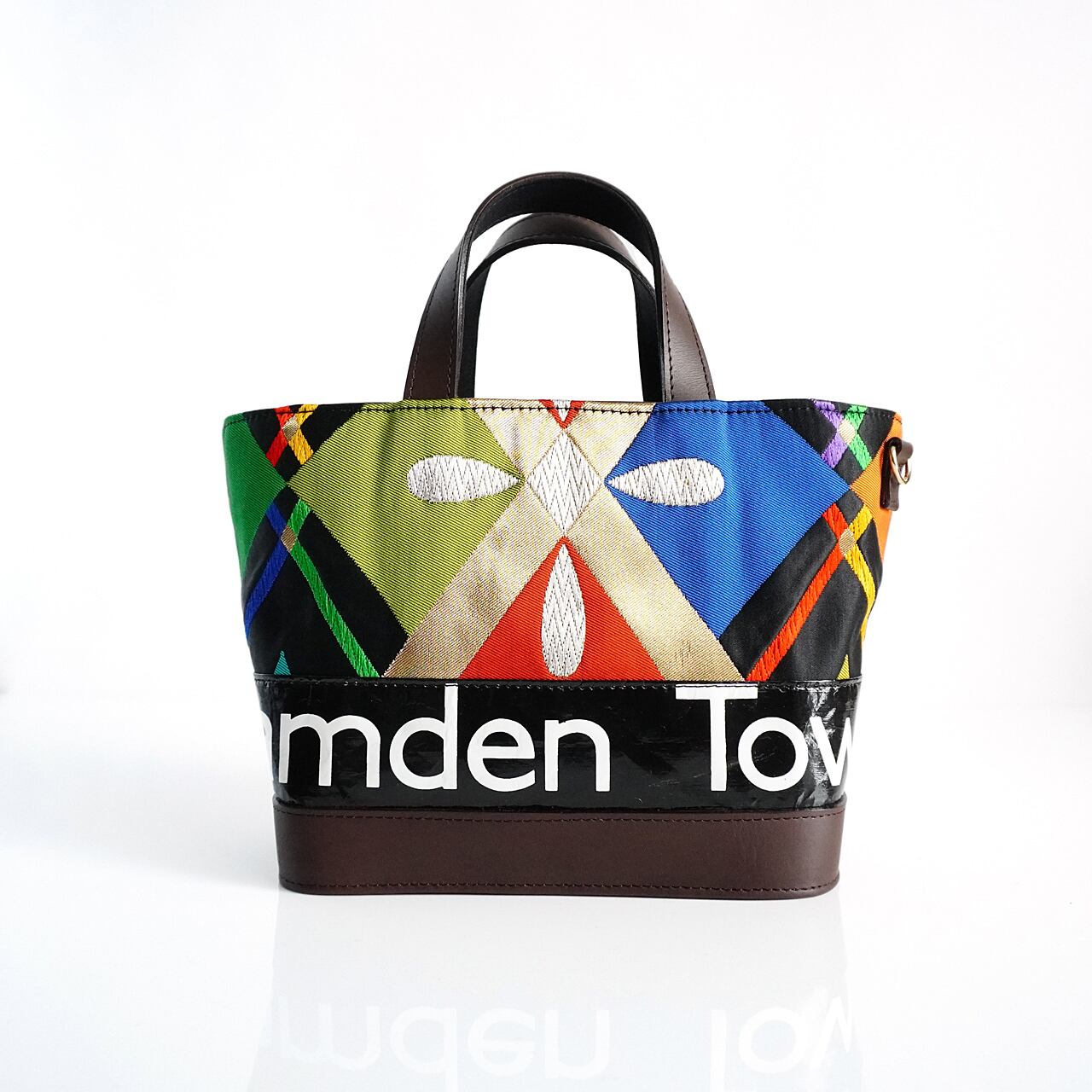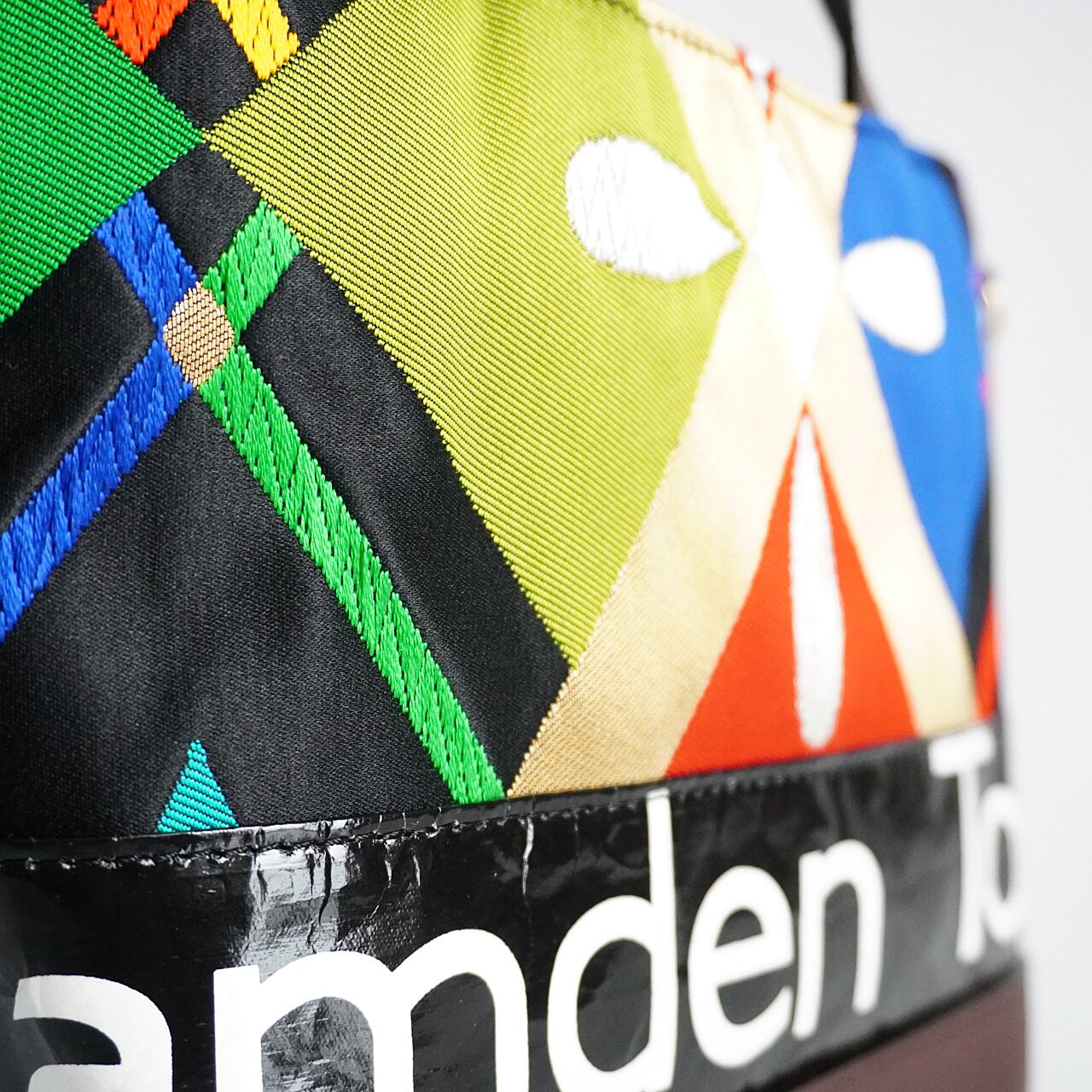 The material from London is the roll sign, which was mounted on a red double- decker London buses in the 80s-90s and it is combined with the vintage Kimono Obi from Kyoto,Japan,which is also produced in the same period.